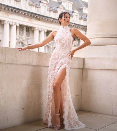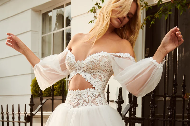 Cut-out dresses are trending—and when done right, they look incredibly stylish. Sau Lee designs keep it tasteful and wedding-appropriate.